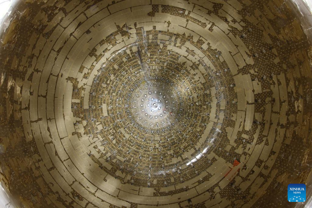 JIANGMEN, 24 noviembre, 2024 (Xinhua) -- Imagen del 22 de noviembre de 2024 del detector central del Observatorio Subterráneo de Neutrinos de Jiangmen (JUNO), en Jiangmen, en la provincia de Guangdong, en el sur de China. La parte principal del detector central se ha construido recientemente. JUNO es uno de los experimentos más potentes del mundo para descubrir el misterio de los neutrinos y se espera que funcione durante al menos 30 años. (Xinhua/Jin Liwang)