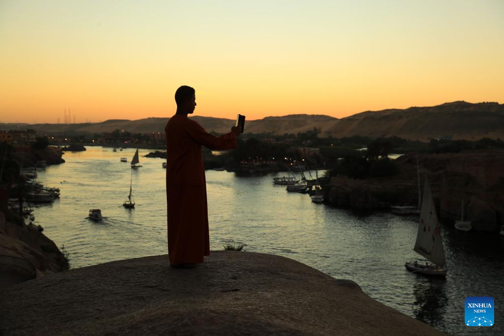 ASUÁN, 25 noviembre, 2024 (Xinhua) -- Imagen del 22 de noviembre de 2024 de un hombre tomando fotografías de la vista del atardecer, en Asuán, Egipto. Asuán, una ciudad del sur de Egipto situada en el curso superior del río Nilo, es uno de los destinos turísticos más famosos del país. Cuenta con ricos recursos turísticos culturales y naturales, atrayendo visitantes de todo el mundo cada año. (Xinhua/Sui Xiankai)