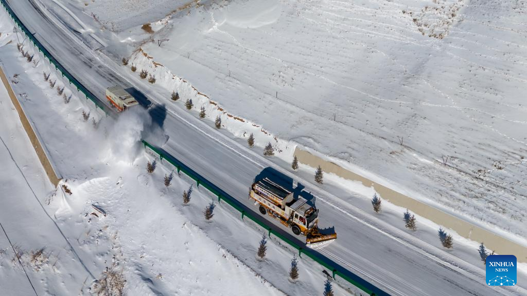 BEIJING, 25 noviembre, 2024 (Xinhua) -- Vista aérea tomada con un dron el 25 de noviembre de 2024 de un quitanieves trabajando en una autopista, en el distrito autónomo de la etnia yugur de Sunan, en la provincia de Gansu, en el noroeste de China. La autoridad meteorológica de China emitió el lunes una alerta amarilla por tormentas de nieve, y se espera que las ventiscas golpeen partes del noreste del país. También el lunes, la entidad renovó una alerta amarilla por una ola de frío, ya que la mayor parte del centro y el norte del país presentará descensos en las temperaturas de entre 6 y 10 grados centígrados en los próximos cuatro días. (Xinhua/Zhang Xiaotian)