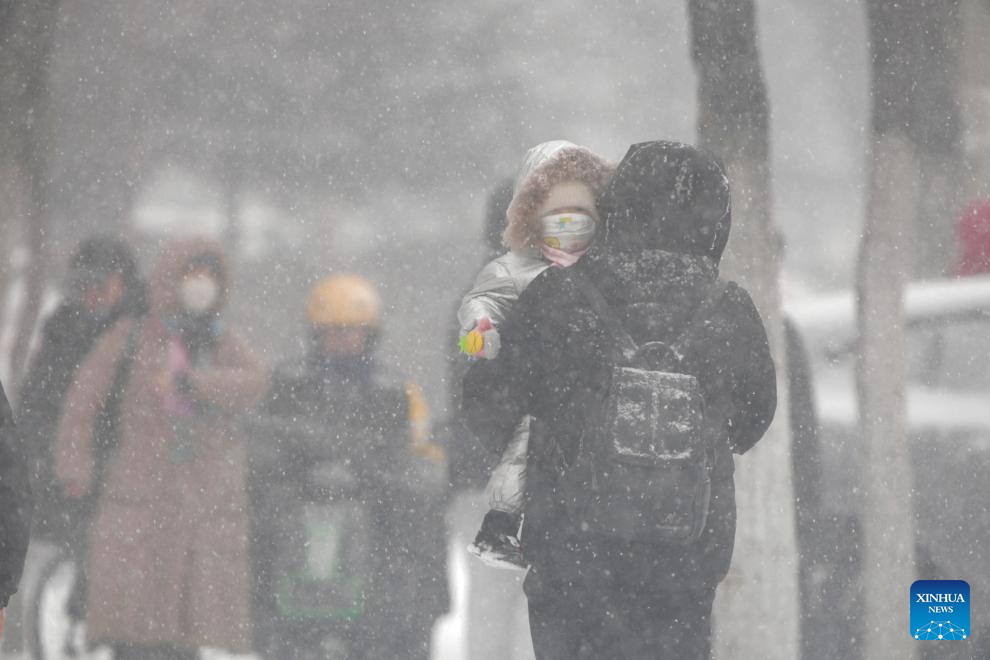 BEIJING, 25 noviembre, 2024 (Xinhua) -- Un peatón carga a un niño en un día nevado, en Qiqihar, en la provincia de Heilongjiang, en el noreste de China, el 25 de noviembre de 2024. La autoridad meteorológica de China emitió el lunes una alerta amarilla por tormentas de nieve, y se espera que las ventiscas golpeen partes del noreste del país. También el lunes, la entidad renovó una alerta amarilla por una ola de frío, ya que la mayor parte del centro y el norte del país presentará descensos en las temperaturas de entre 6 y 10 grados centígrados en los próximos cuatro días. (Xinhua/Wang Yonggang)