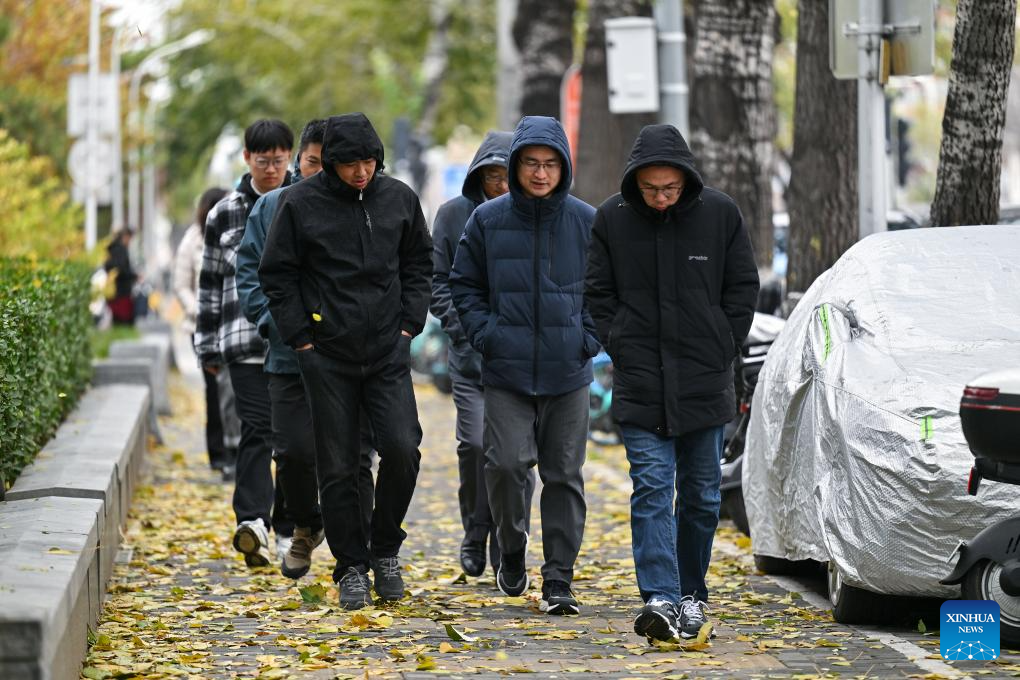 BEIJING, 25 noviembre, 2024 (Xinhua) -- Personas caminan por una calle, en Beijing, capital de China, el 25 de noviembre de 2024. La autoridad meteorológica de China emitió el lunes una alerta amarilla por tormentas de nieve, y se espera que las ventiscas golpeen partes del noreste del país. También el lunes, la entidad renovó una alerta amarilla por una ola de frío, ya que la mayor parte del centro y el norte del país presentará descensos en las temperaturas de entre 6 y 10 grados centígrados en los próximos cuatro días. (Xinhua/Li Xin)