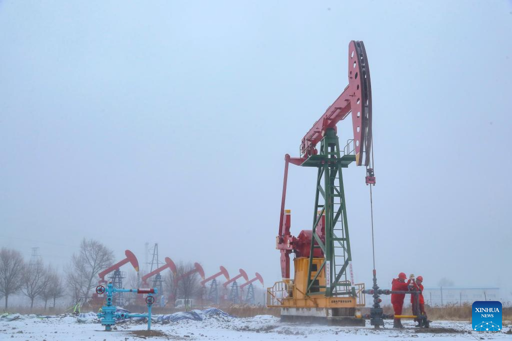 BEIJING, 25 noviembre, 2024 (Xinhua) -- Trabajadores laboran en una plataforma petrolera en un día nevado en el Yacimiento Petrolífero de Daqing, en Daqing, en la provincia de Heilongjiang, en el noreste de China, el 25 de noviembre de 2024. La autoridad meteorológica de China emitió el lunes una alerta amarilla por tormentas de nieve, y se espera que las ventiscas golpeen partes del noreste del país. También el lunes, la entidad renovó una alerta amarilla por una ola de frío, ya que la mayor parte del centro y el norte del país presentará descensos en las temperaturas de entre 6 y 10 grados centígrados en los próximos cuatro días. (Xinhua/Ma Ke)