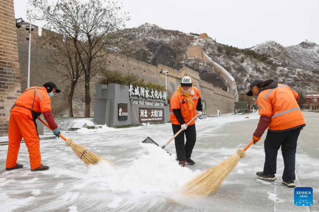 BEIJING, 25 noviembre, 2024 (Xinhua) -- Trabajadores de saneamiento limpian la nieve, en Zhangjiakou, en la provincia de Hebei, en el norte de China, el 25 de noviembre de 2024. La autoridad meteorológica de China emitió el lunes una alerta amarilla por tormentas de nieve, y se espera que las ventiscas golpeen partes del noreste del país. También el lunes, la entidad renovó una alerta amarilla por una ola de frío, ya que la mayor parte del centro y el norte del país presentará descensos en las temperaturas de entre 6 y 10 grados centígrados en los próximos cuatro días. (Xinhua/Wu Diansen)