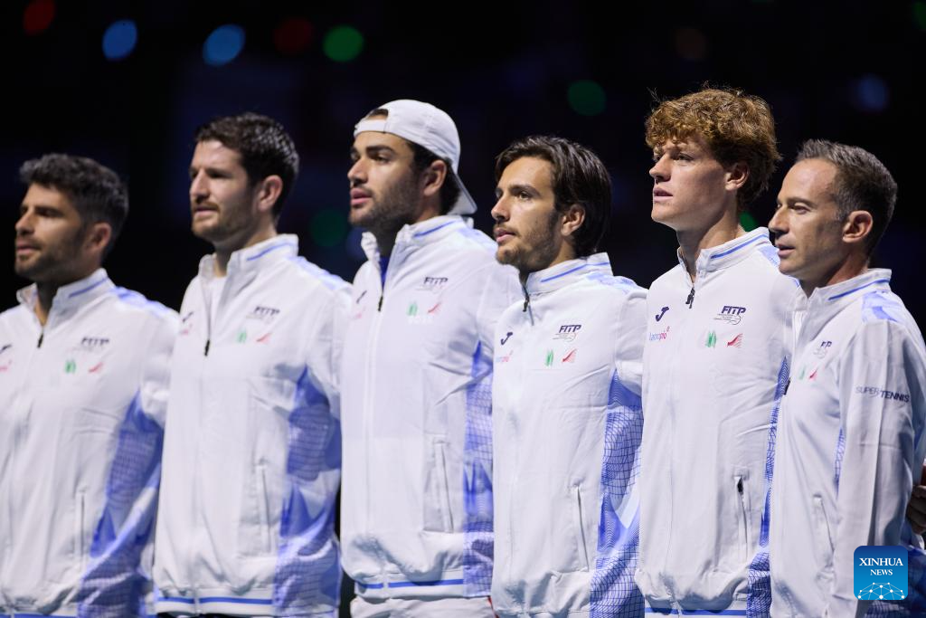 MÁLAGA, 25 noviembre, 2024 (Xinhua) -- Imagen del 24 de noviembre de 2024 del equipo de Italia alineándose previo a la final entre Italia y Países Bajos en el torneo de tenis de las Finales de la Copa Davis, en Málaga, España. (Xinhua/Meng Dingbo)