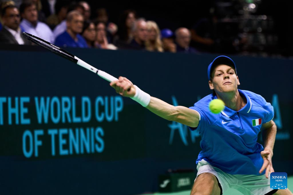 MÁLAGA, 25 noviembre, 2024 (Xinhua) -- Imagen del 24 de noviembre de 2024 de Yannick Sinner, de Italia, devolviendo la pelota a Tallon Griekspoor, de Países Bajos, durante la final entre Italia y Países Bajos en el torneo de tenis de las Finales de la Copa Davis, en Málaga, España. (Xinhua/Meng Dingbo)