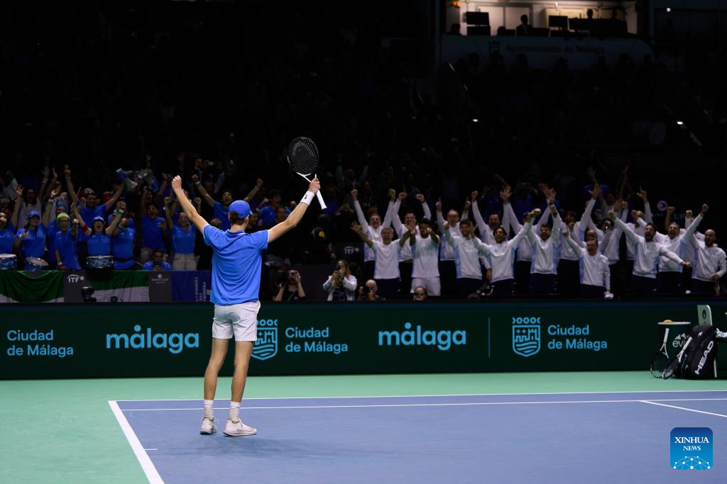 MÁLAGA, 25 noviembre, 2024 (Xinhua) -- Imagen del 24 de noviembre de 2024 de Yannick Sinner, de Italia, festejando después de derrotar a Tallon Griekspoor, de Países Bajos, durante la final entre Italia y Países Bajos en el torneo de tenis de las Finales de la Copa Davis, en Málaga, España. (Xinhua/Meng Dingbo)