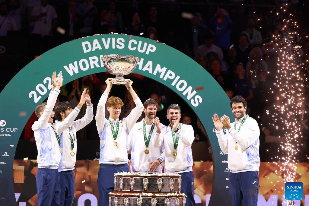 MÁLAGA, 25 noviembre, 2024 (Xinhua) -- Imagen del 24 de noviembre de 2024 del equipo de Italia festejando durante la ceremonia de victoria al término de la final entre Italia y Países Bajos en el torneo de tenis de las Finales de la Copa Davis, en Málaga, España. (Xinhua/Meng Dingbo)