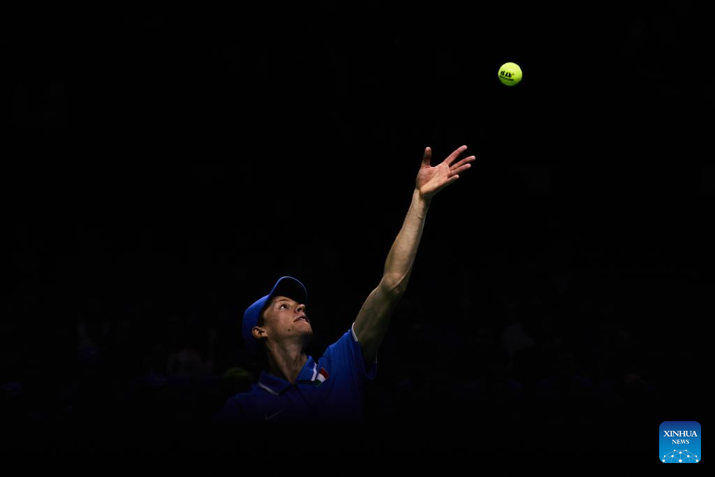 MÁLAGA, 25 noviembre, 2024 (Xinhua) -- Imagen del 24 de noviembre de 2024 de Yannick Sinner, de Italia, sirviendo la pelota a Tallon Griekspoor, de Países Bajos, durante la final entre Italia y Países Bajos en el torneo de tenis de las Finales de la Copa Davis, en Málaga, España. (Xinhua/Meng Dingbo)