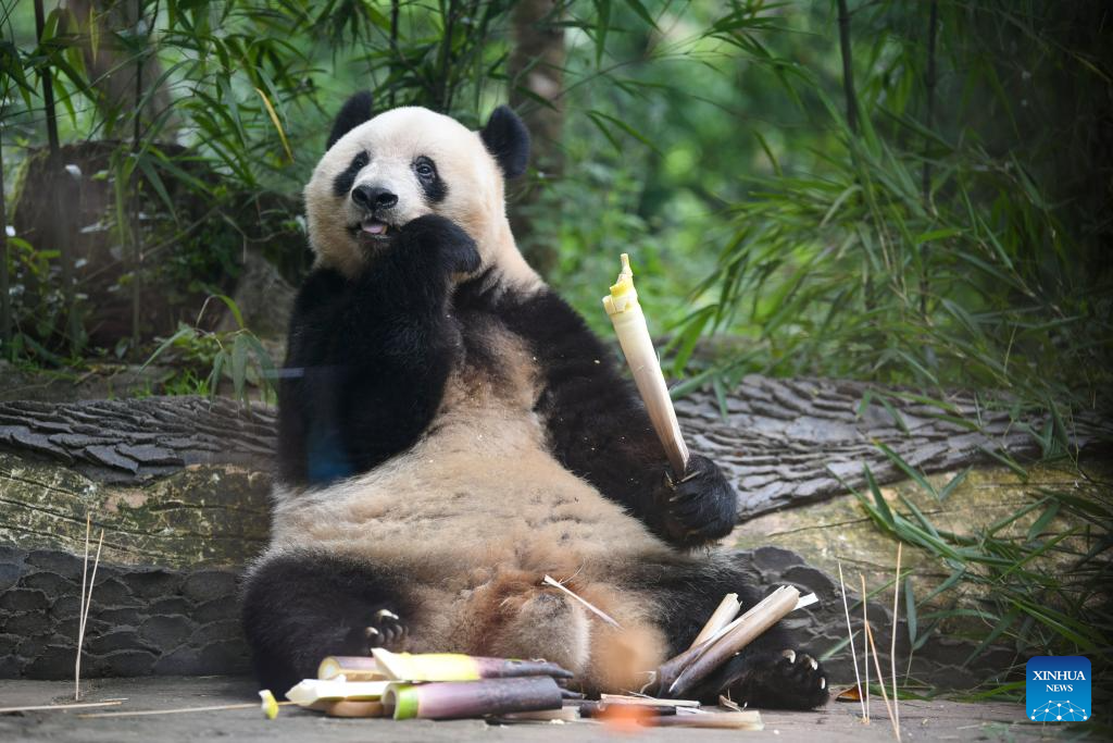 CHENGDU, 25 noviembre, 2024 (Xinhua) -- Imagen del 26 de junio de 2024 del panda gigante Mei Sheng comiendo brotes de bambú en la Base del Panda de Bifengxia del Centro de Conservación e Investigación del Panda Gigante de China, en Ya'an, en la provincia de Sichuan, suroeste de China. El macho Mei Sheng, nació en el Zoológico de San Diego en Estados Unidos, el 19 de agosto de 2003. Unicos en China y adorados en todo el mundo, los pandas gigantes han servido como embajadores de la amistad que llevan la buena voluntad del pueblo chino más allá de las fronteras. Desde la década de 1990, China ha llevado a cabo iniciativas de investigación conjunta sobre protección con 26 instituciones de 20 países. Por lo general, los cachorros de panda gigante nacidos en el extranjero son devueltos a China cuando alcanzan cierta edad. Al regresar del extranjero, la mayoría de ellos vivirán en el Centro de Conservación e Investigación de Pandas Gigantes de China o en la Base de Investigación de Cría de Pandas Gigantes de Chengdu. (Xinhua/Xu Bingjie)