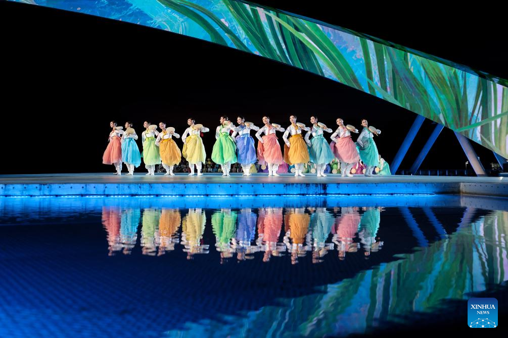 SANYA, 26 noviembre, 2024 (Xinhua) -- Artistas realizan una presentación durante una gala celebrada en los XII Juegos Tradicionales Nacionales de Minorías Etnicas de China, en Sanya, en la provincia de Hainan, en el sur de China, el 26 de noviembre de 2024. (Xinhua/Guo Cheng)