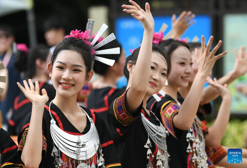 SANYA, 26 noviembre, 2024 (Xinhua) -- Artistas saludan a los invitados durante una gala celebrada en los XII Juegos Tradicionales Nacionales de Minorías Etnicas de China, en Sanya, en la provincia de Hainan, en el sur de China, el 26 de noviembre de 2024. (Xinhua/Yang Wenbin)