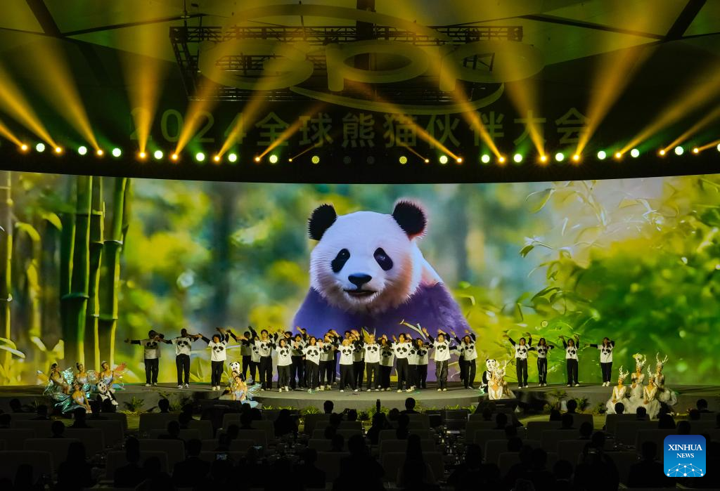 CHENGDU, 26 noviembre, 2024 (Xinhua) -- Artistas ponen en escena un coro durante la conferencia Global Panda Partners 2024, en Chengdu, en la provincia de Sichuan, en el suroeste de China, el 26 de noviembre de 2024. El evento fue inaugurado el martes aquí con el tema "Coexistencia Armoniosa entre el Hombre y la Naturaleza". (Xinhua/Shen Bohan)