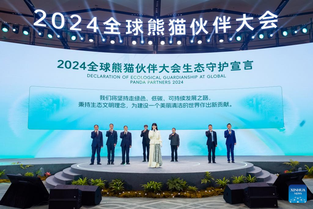 CHENGDU, 26 noviembre, 2024 (Xinhua) -- Invitados participan en la Declaración de Tutela Ecológica en la conferencia Global Panda Partners 2024, en Chengdu, en la provincia de Sichuan, en el suroeste de China, el 26 de noviembre de 2024. El evento fue inaugurado el martes aquí con el tema "Coexistencia Armoniosa entre el Hombre y la Naturaleza". (Xinhua/Shen Bohan)