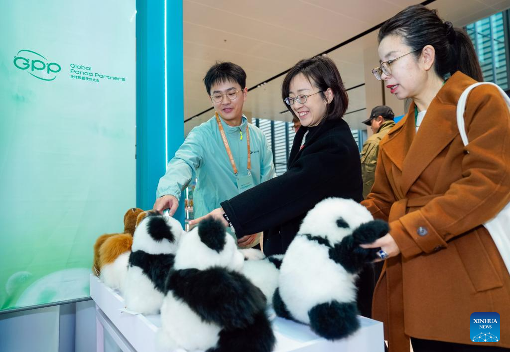 CHENGDU, 26 noviembre, 2024 (Xinhua) -- Invitados observan juguetes de peluche de pandas gigantes durante la conferencia Global Panda Partners 2024, en Chengdu, en la provincia de Sichuan, en el suroeste de China, el 26 de noviembre de 2024. El evento fue inaugurado el martes aquí con el tema "Coexistencia Armoniosa entre el Hombre y la Naturaleza". (Xinhua/Shen Bohan)