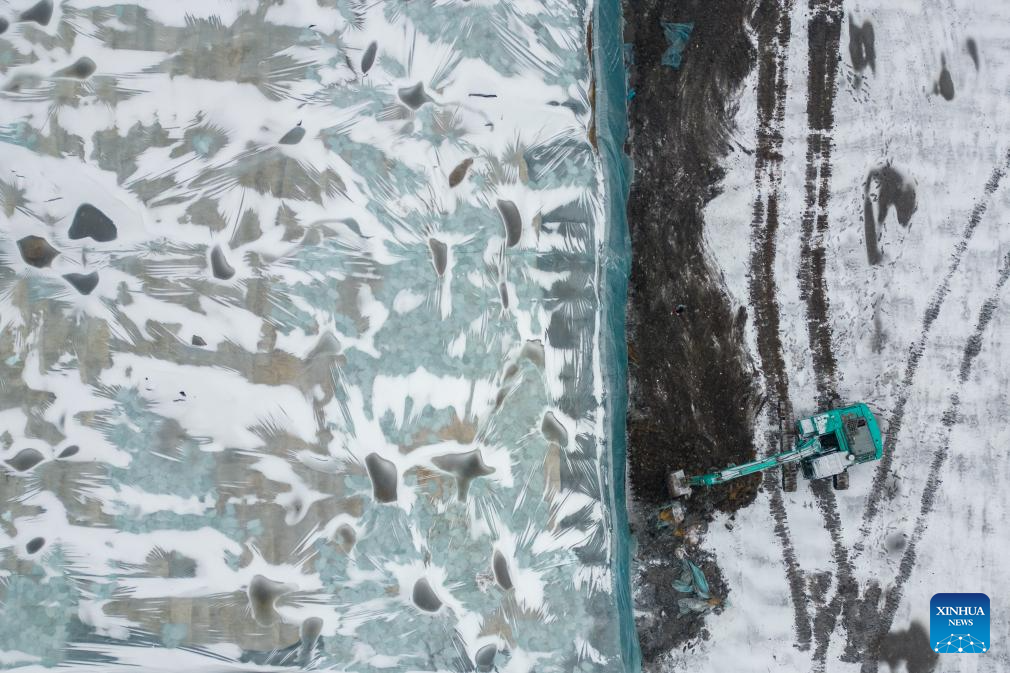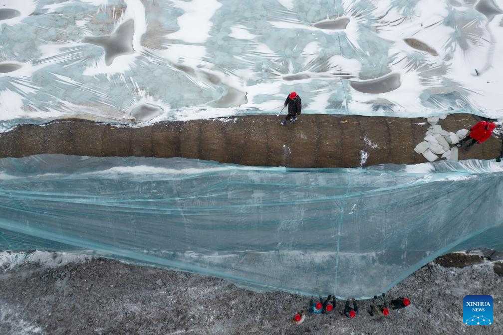 HARBIN, 26 noviembre, 2024 (Xinhua) -- Imagen aérea tomada con un dron de trabajadores retirando el material de aislamiento térmico que cubre una reserva de cubos de hielo previo a la construcción del 26º Mundo de Hielo y Nieve de Harbin, en Harbin, en la provincia de Heilongjiang, en el noreste de China, el 26 de noviembre de 2024. El Mundo de Hielo y Nieve de Harbin es un famoso parque temático de temporada en Harbin que goza de gran popularidad cada invierno. Este año, el parque destacará a los próximos Juegos Asiáticos de Invierno, un evento deportivo programado para febrero de 2025 en la provincia de Heilongjiang. (Xinhua/Zhang Tao)