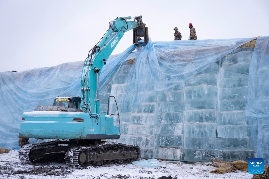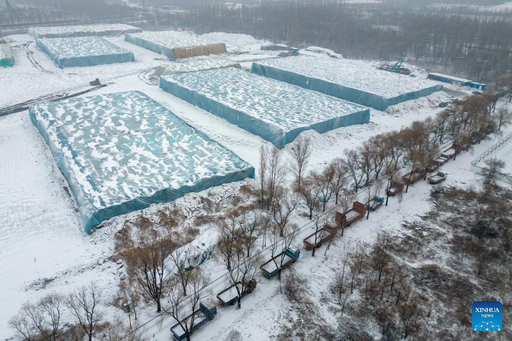 HARBIN, 26 noviembre, 2024 (Xinhua) -- Trabajadores retiran el material de aislamiento térmico que cubre una reserva de cubos de hielo previo a la construcción del 26º Mundo de Hielo y Nieve de Harbin, en Harbin, en la provincia de Heilongjiang, en el noreste de China, el 26 de noviembre de 2024. El Mundo de Hielo y Nieve de Harbin es un famoso parque temático de temporada en Harbin que goza de gran popularidad cada invierno. Este año, el parque destacará a los próximos Juegos Asiáticos de Invierno, un evento deportivo programado para febrero de 2025 en la provincia de Heilongjiang. (Xinhua/Xie Jianfei)