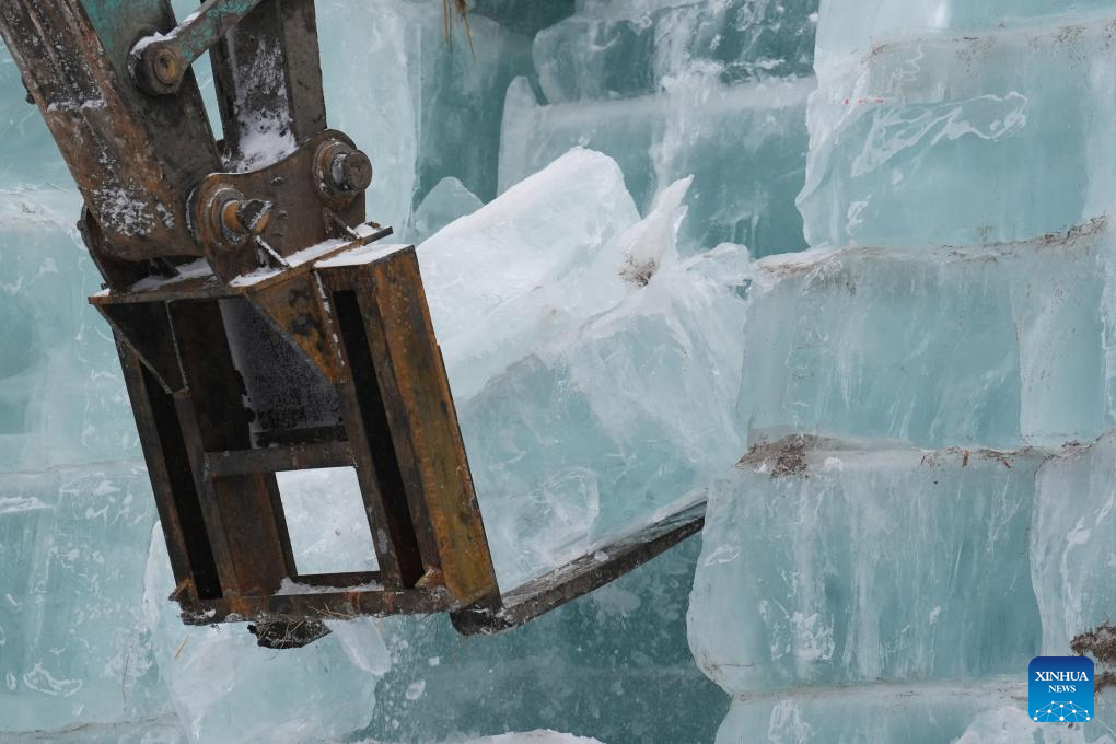 HARBIN, 26 noviembre, 2024 (Xinhua) -- Un vehículo de ingeniería recoge cubos de hielo para ser usados en la construcción del 26º Mundo de Hielo y Nieve de Harbin, en Harbin, en la provincia de Heilongjiang, en el noreste de China, el 26 de noviembre de 2024. El Mundo de Hielo y Nieve de Harbin es un famoso parque temático de temporada en Harbin que goza de gran popularidad cada invierno. Este año, el parque destacará a los próximos Juegos Asiáticos de Invierno, un evento deportivo programado para febrero de 2025 en la provincia de Heilongjiang. (Xinhua/Wang Song)