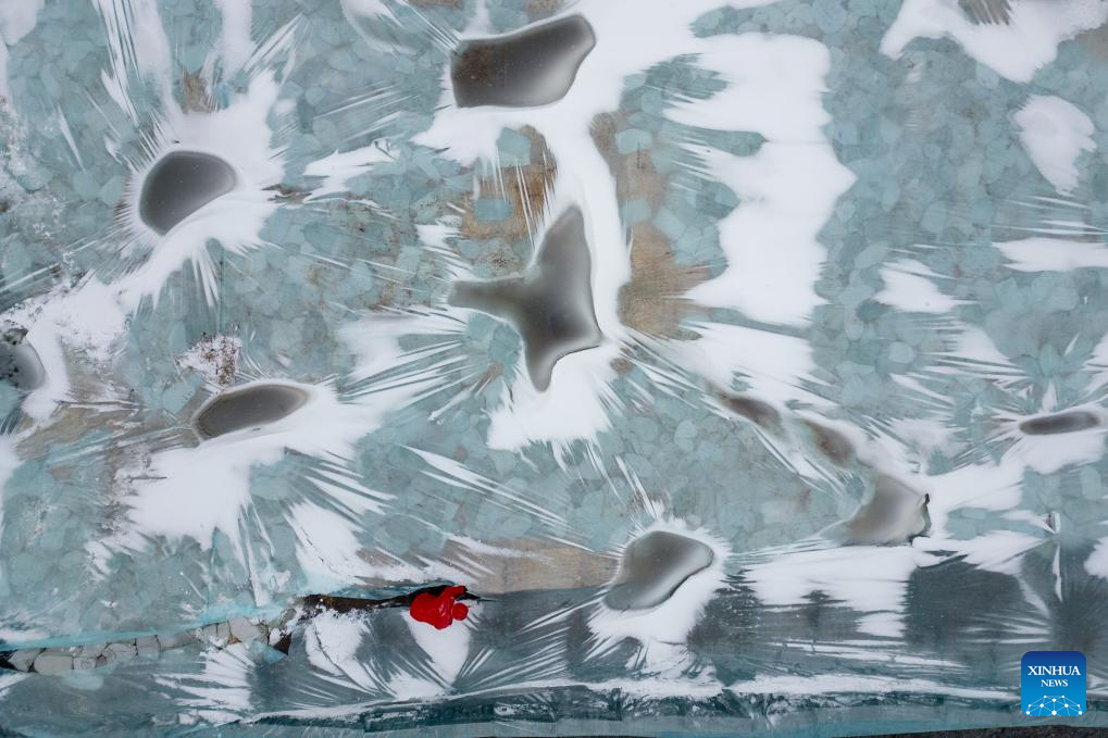 HARBIN, 26 noviembre, 2024 (Xinhua) -- Imagen aérea tomada con un dron de un trabajador retirando el material de aislamiento térmico que cubre una reserva de cubos de hielo previo a la construcción del 26º Mundo de Hielo y Nieve de Harbin, en Harbin, en la provincia de Heilongjiang, en el noreste de China, el 26 de noviembre de 2024. El Mundo de Hielo y Nieve de Harbin es un famoso parque temático de temporada en Harbin que goza de gran popularidad cada invierno. Este año, el parque destacará a los próximos Juegos Asiáticos de Invierno, un evento deportivo programado para febrero de 2025 en la provincia de Heilongjiang. (Xinhua/Zhang Tao)