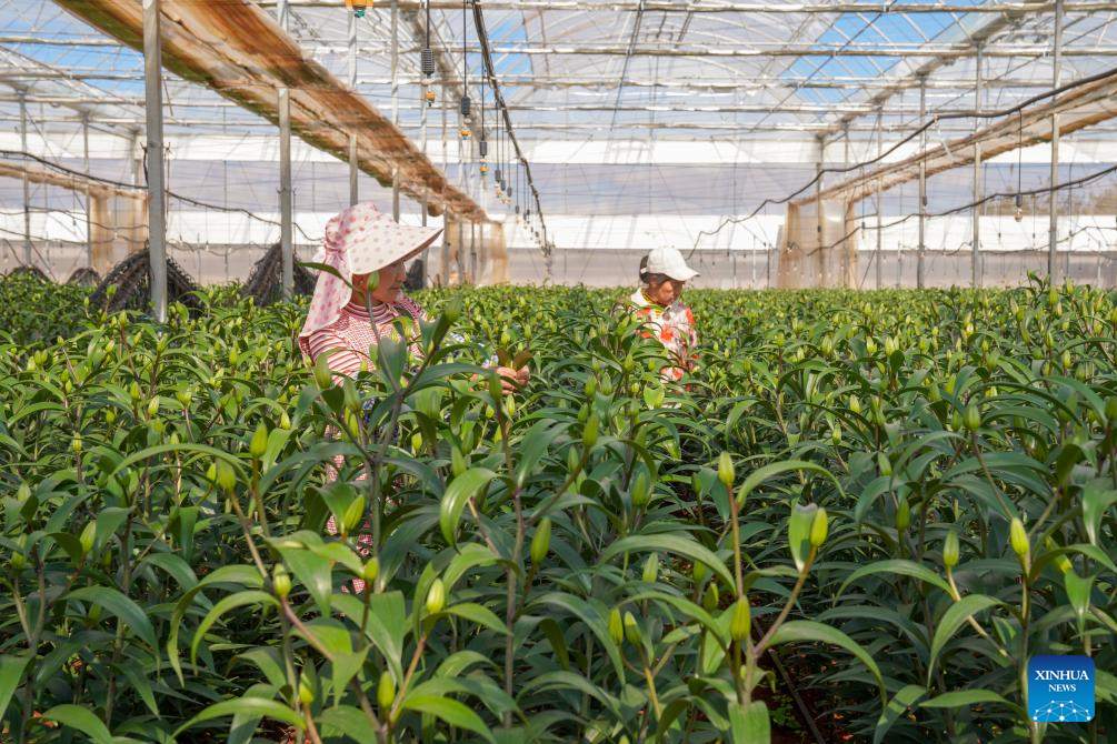 KUNMING, 27 noviembre, 2024 (Xinhua) -- Imagen del 25 de noviembre de 2024 de trabajadoras revisando el crecimiento de las flores en una base de plantación de flores, en Kunming, en la provincia de Yunnan, en el suroeste de China. Yunnan, uno de los principales proveedores de flores para la decoración del Año Nuevo Lunar, ha sido testigo recientemente del comienzo de la temporada alta anual. Estas flores, populares en torno al período del festival de la primavera (normalmente desde principios de diciembre hasta el Festival de las Linternas del año siguiente), no sólo se venden en todo el país, sino también en mercados extranjeros como Japón y Rusia. (Xinhua/Peng Yikai)