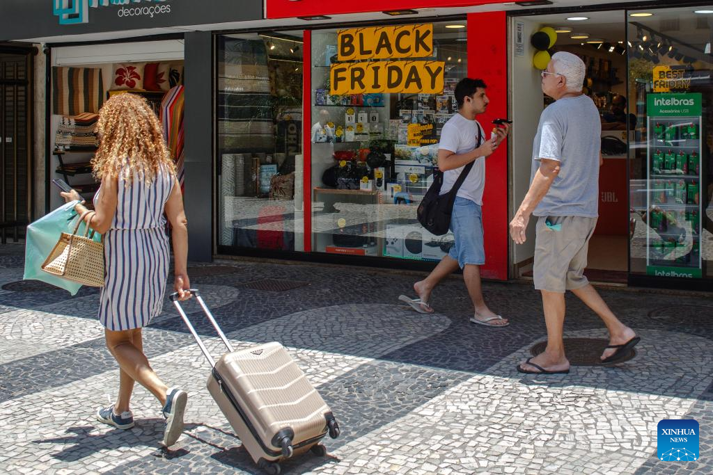 RIO DE JANEIRO, 27 noviembre, 2024 (Xinhua) -- Personas caminan frente al escaparate de una tienda con un anuncio del "Black Friday" o Viernes Negro, en Río de Janeiro, Brasil, el 27 de noviembre de 2024. (Xinhua/Claudia Martini)