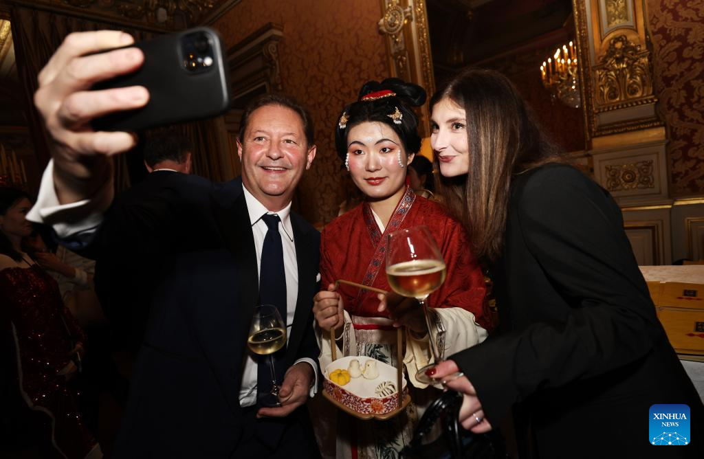 PARIS, 27 noviembre, 2024 (Xinhua) -- Imagen del 25 de noviembre de 2024 de invitados tomándose una fotografía con una empleada china después de probar los famosos pasteles de la corte real china del restaurante Fangshan, situado en el histórico parque Beihai en Beijing, en la ceremonia de presentación de la clasificación mundial de restaurantes LA LISTE 2025 en el Ministerio de Asuntos Exteriores de Francia, en París, Francia. LA LISTE 2025, la última actualización de una lista de los mejores restaurantes del mundo, fue presentada aquí el lunes. (Xinhua/Gao Jing)