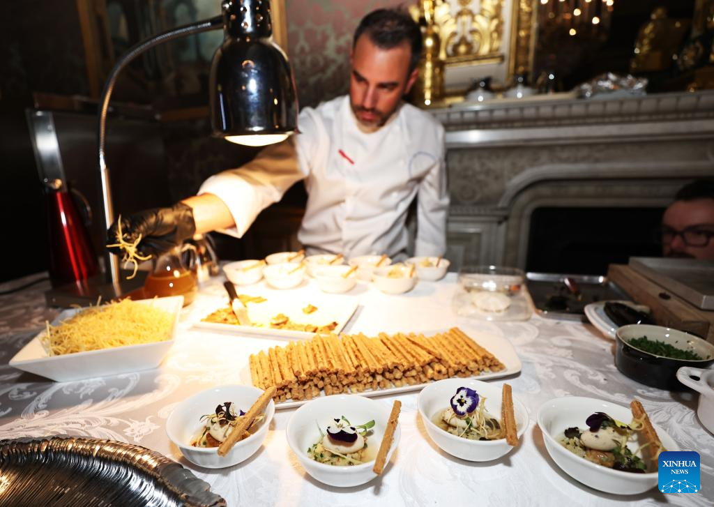 PARIS, 27 noviembre, 2024 (Xinhua) -- Imagen del 25 de noviembre de 2024 de un chef francés preparando comida gourmet en la ceremonia de presentación de la clasificación mundial de restaurantes LA LISTE 2025 en el Ministerio de Asuntos Exteriores de Francia, en París, Francia. LA LISTE 2025, la última actualización de una lista de los mejores restaurantes del mundo, fue presentada aquí el lunes. (Xinhua/Gao Jing)