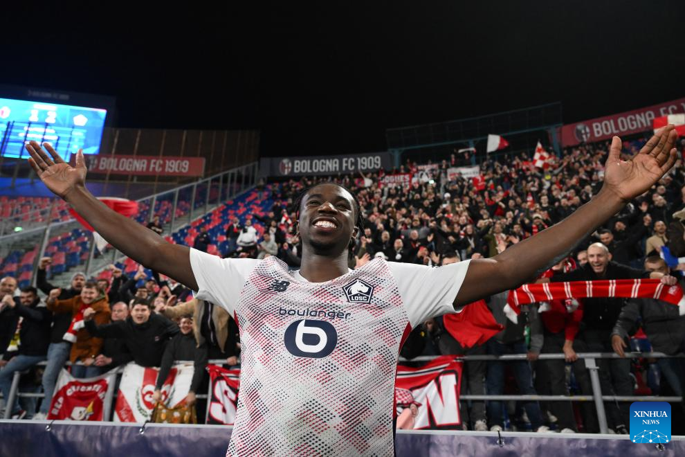 BOLONIA, 28 noviembre, 2024 (Xinhua) -- Imagen del 27 de noviembre de 2024 de Ngal'Ayel Mukau, de Lille, festejando al término del partido de fase de liga entre Bologna y Lille en la Liga de Campeones de la UEFA, en Bolonia, Italia. (Xinhua/Alberto Lingria)