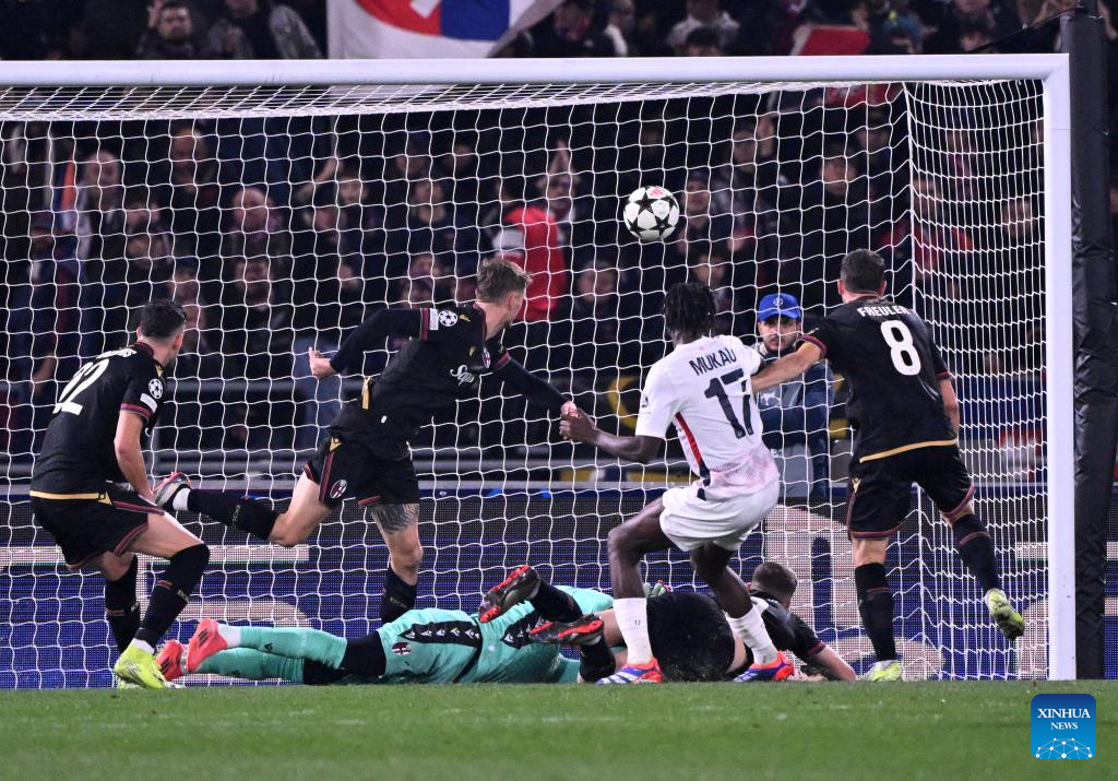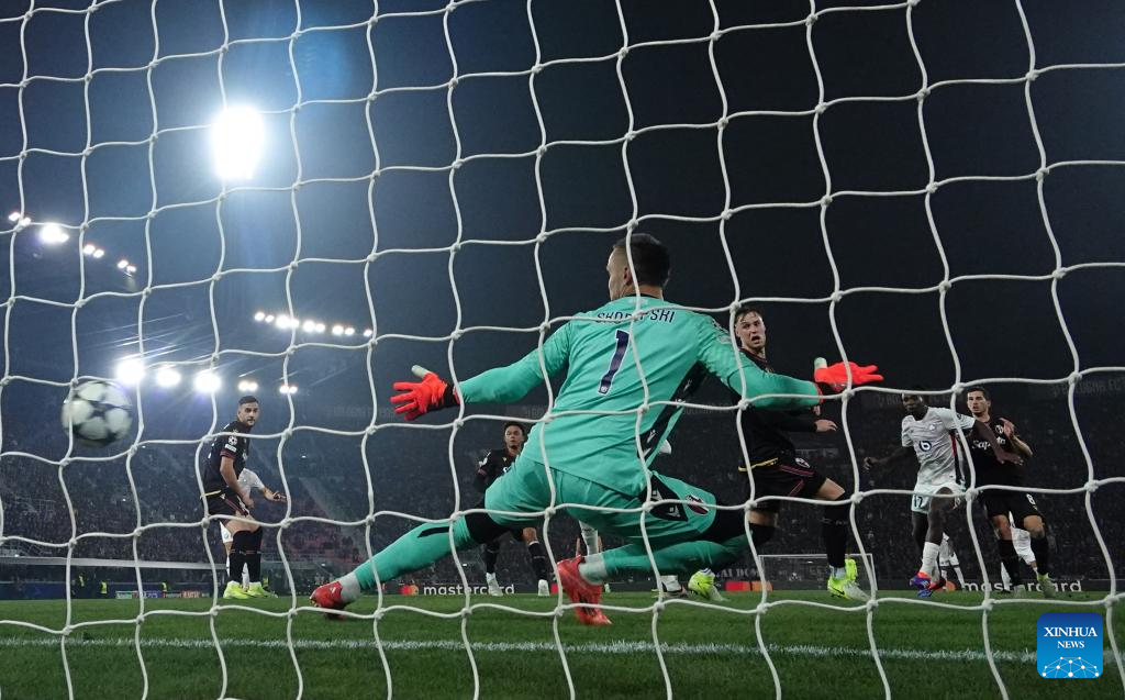 BOLONIA, 28 noviembre, 2024 (Xinhua) -- Imagen del 27 de noviembre de 2024 de Ngal'Ayel Mukau (3-d), de Lille, realizando una anotación durante el partido de fase de liga entre Bologna y Lille en la Liga de Campeones de la UEFA, en Bolonia, Italia. (Xinhua/Alberto Lingria)