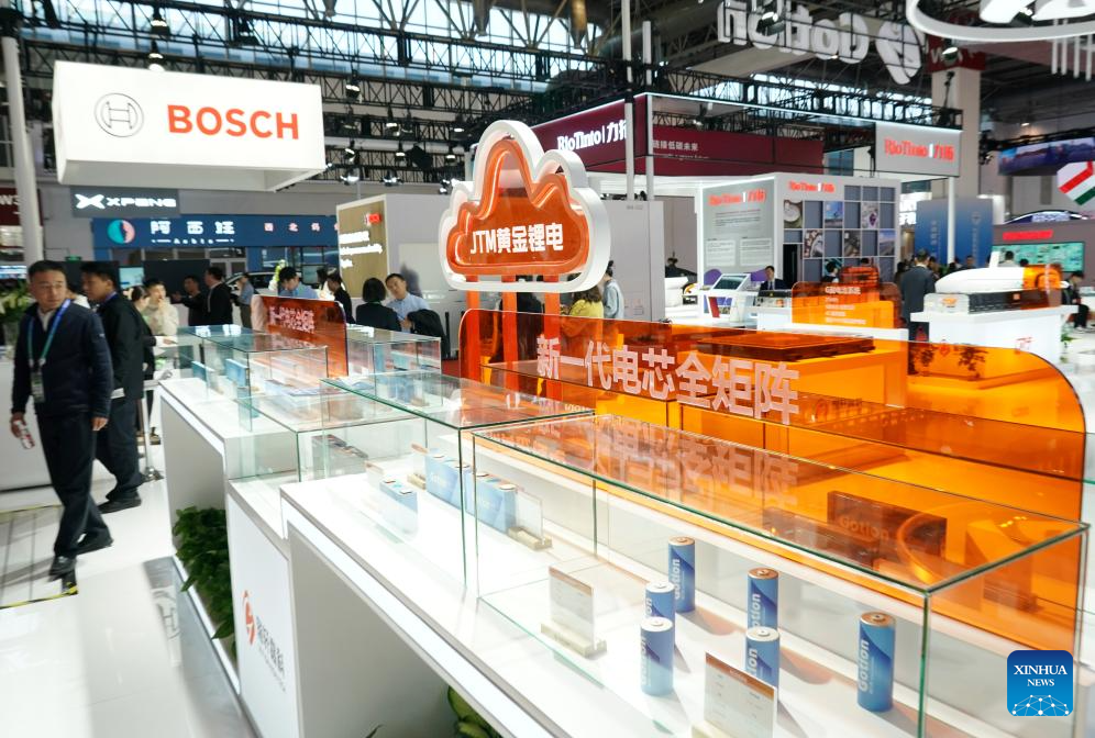 BEIJING, 28 noviembre, 2024 (Xinhua) -- Imagen del 26 de noviembre de 2024 de productos de baterías de litio en el estand de Gotion en la segunda Exposición Internacional de Cadenas de Suministro de China (CISCE, por sus siglas en inglés), en Beijing, capital de China. El área de exhibición de vehículos inteligentes de la exposición muestra tecnologías y productos clave involucrados en toda la cadena industrial de vehículos inteligentes, que abarcan desde materias primas básicas y componentes clave hasta servicios relevantes. Rio Tinto, Bosch, Baowu Steel y XPENG albergan un estand conjunto en el área de exhibición de vehículos inteligentes este año, lo que demuestra la profunda integración y cooperación de los actores relacionados a lo largo de la cadena de suministro de la cadena industrial global. (Xinhua/Zhang Chenlin)