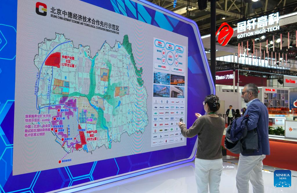 BEIJING, 28 noviembre, 2024 (Xinhua) -- Un visitante conversa con una trabajadora en el estand de la Zona de Demostración de Cooperación Económica y Tecnológica entre China y Alemania en la segunda Exposición Internacional de Cadenas de Suministro de China (CISCE, por sus siglas en inglés), en Beijing, capital de China, el 28 de noviembre de 2024. El área de exhibición de vehículos inteligentes de la exposición muestra tecnologías y productos clave involucrados en toda la cadena industrial de vehículos inteligentes, que abarcan desde materias primas básicas y componentes clave hasta servicios relevantes. Rio Tinto, Bosch, Baowu Steel y XPENG albergan un estand conjunto en el área de exhibición de vehículos inteligentes este año, lo que demuestra la profunda integración y cooperación de los actores relacionados a lo largo de la cadena de suministro de la cadena industrial global. (Xinhua/Xiao Ennan)