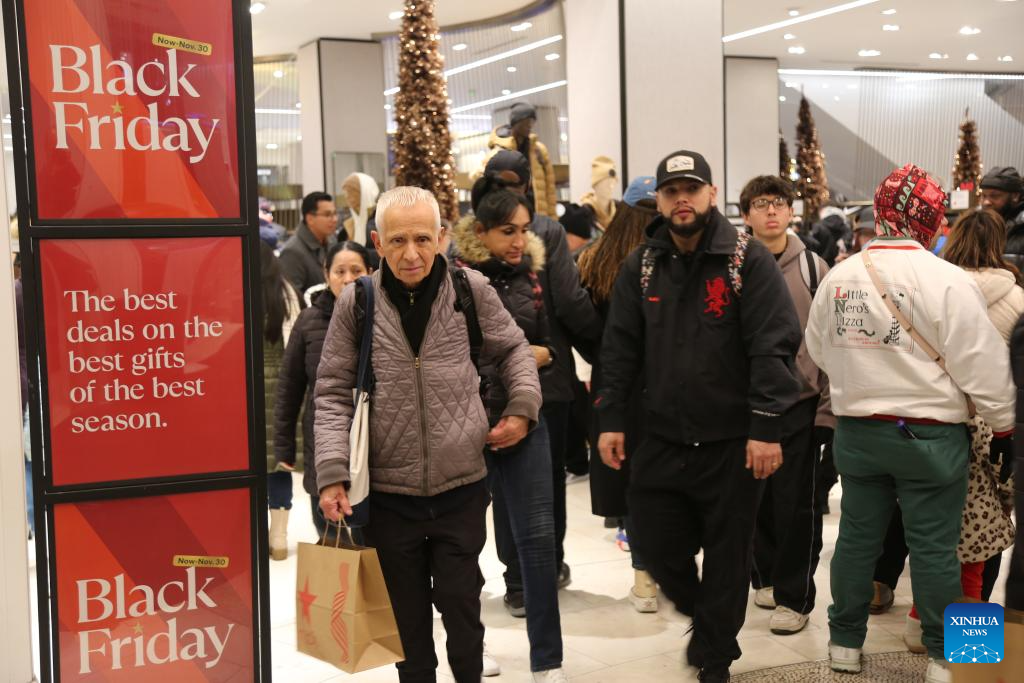NUEVA YORK, 30 noviembre, 2024 (Xinhua) -- Imagen del 29 de noviembre de 2024 de consumidores caminando junto a carteles de rebajas del Viernes Negro o "Black Friday" en una tienda, en Manhattan, Nueva York, Estados Unidos. (Xinhua/Liu Yanan)