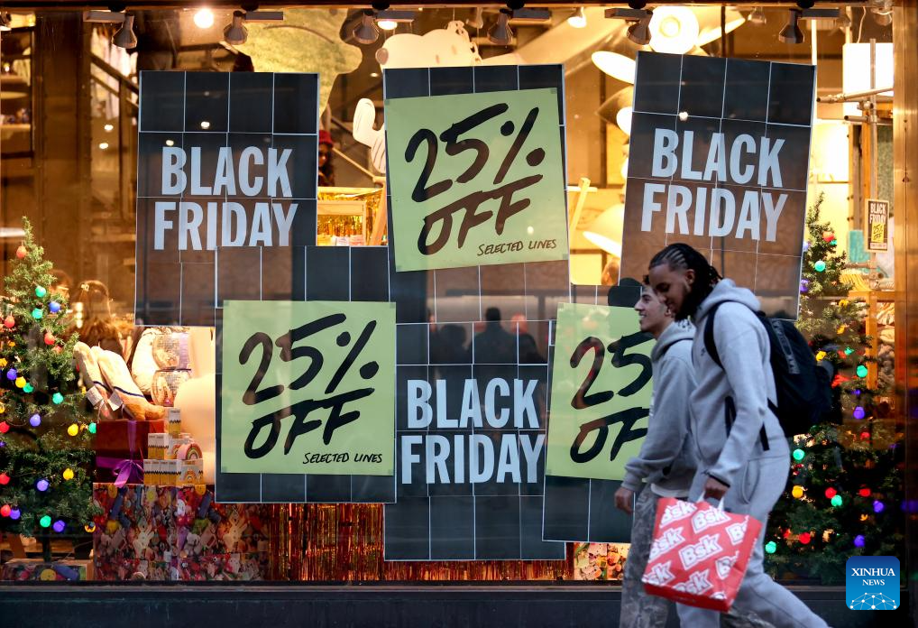LONDRES, 30 noviembre, 2024 (Xinhua) -- Imagen del 29 de noviembre de 2024 de personas caminando frente a un escaparate que muestra carteles de rebajas del Viernes Negro o "Black Friday" en la calle Oxford, en Londres, Reino Unido. (Xinhua/Li Ying)
