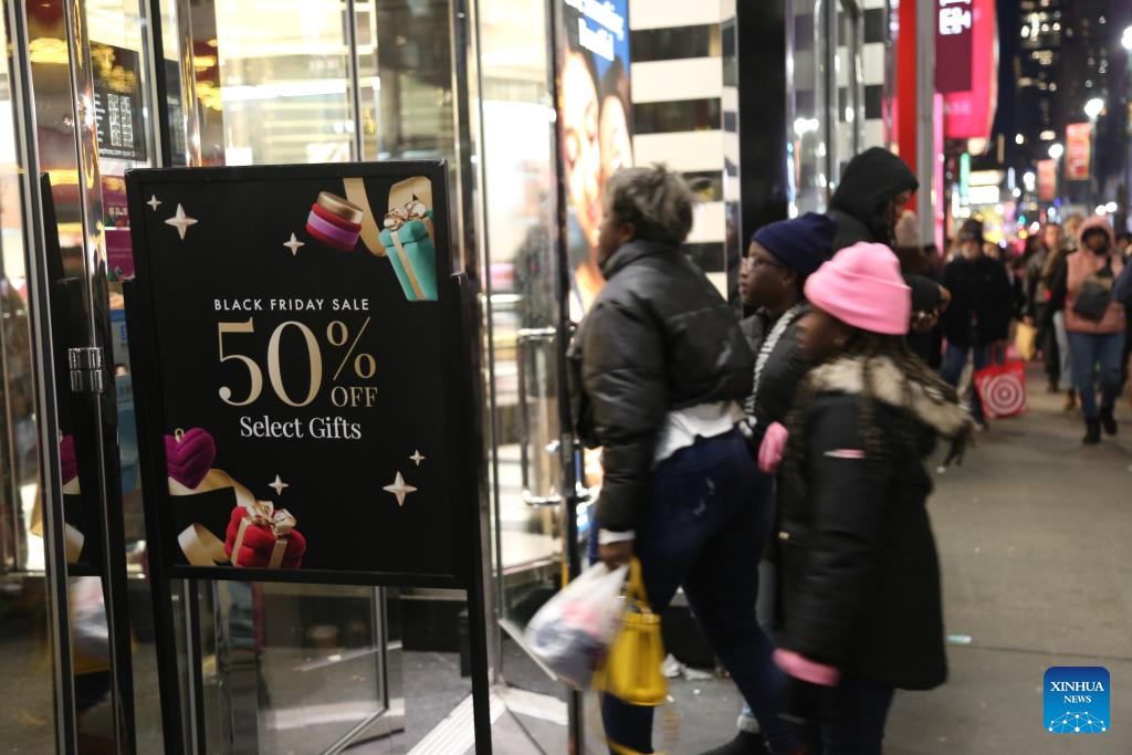 NUEVA YORK, 30 noviembre, 2024 (Xinhua) -- Imagen del 29 de noviembre de 2024 de consumidores caminando junto a un cartel de rebajas del Viernes Negro o "Black Friday", en Manhattan, Nueva York, Estados Unidos. (Xinhua/Liu Yanan)