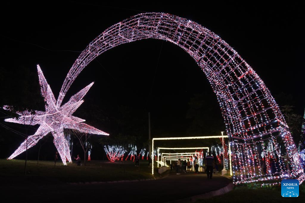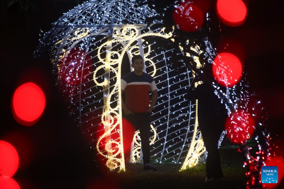 LA LIBERTAD, 29 noviembre, 2024 (Xinhua) -- Imagen del 28 de noviembre de 2024 de personas disfrutando de estructuras con luces navideñas en el parque El Principito, en el departamento de La Libertad, El Salvador. (Xinhua/Alexander Peña)