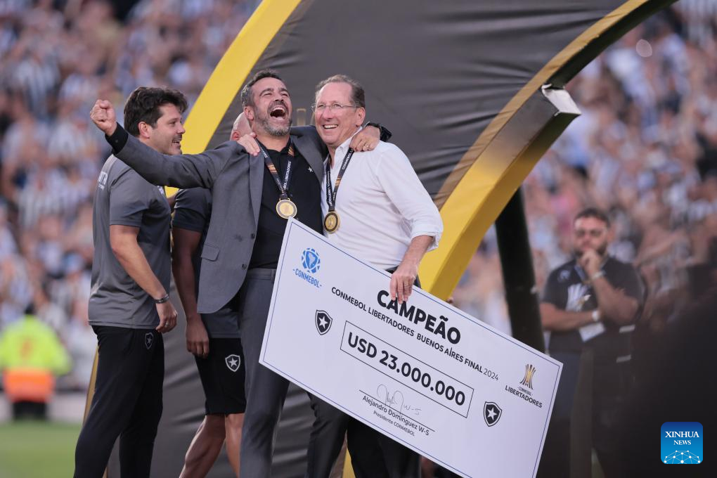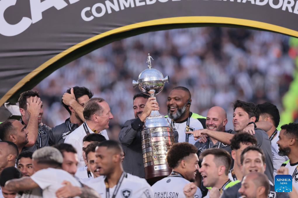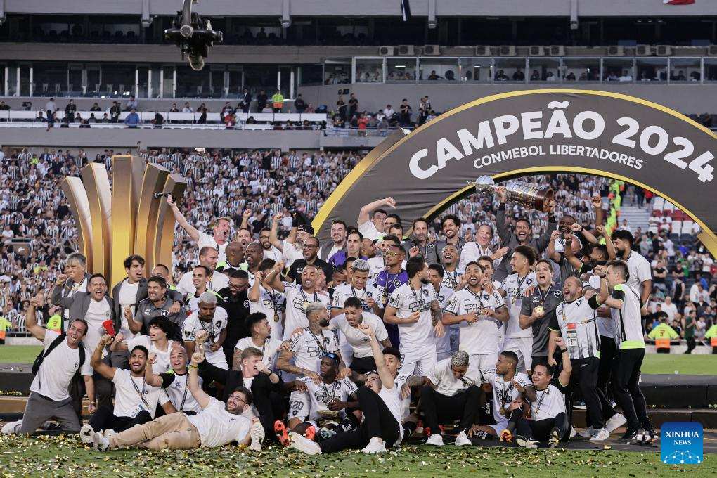 BUENOS AIRES, 30 noviembre, 2024 (Xinhua) -- Jugadores de Botafogo de Brasil festejan con el trofeo durante la ceremonia de premiación al término del partido correspondiente a la final de la Copa Conmebol Libertadores, ante Atlético Mineiro de Brasil, celebrado en el estadio Mas Monumental, en la ciudad de Buenos Aires, capital de Argentina, el 30 de noviembre de 2024. (Xinhua/Luciano González)