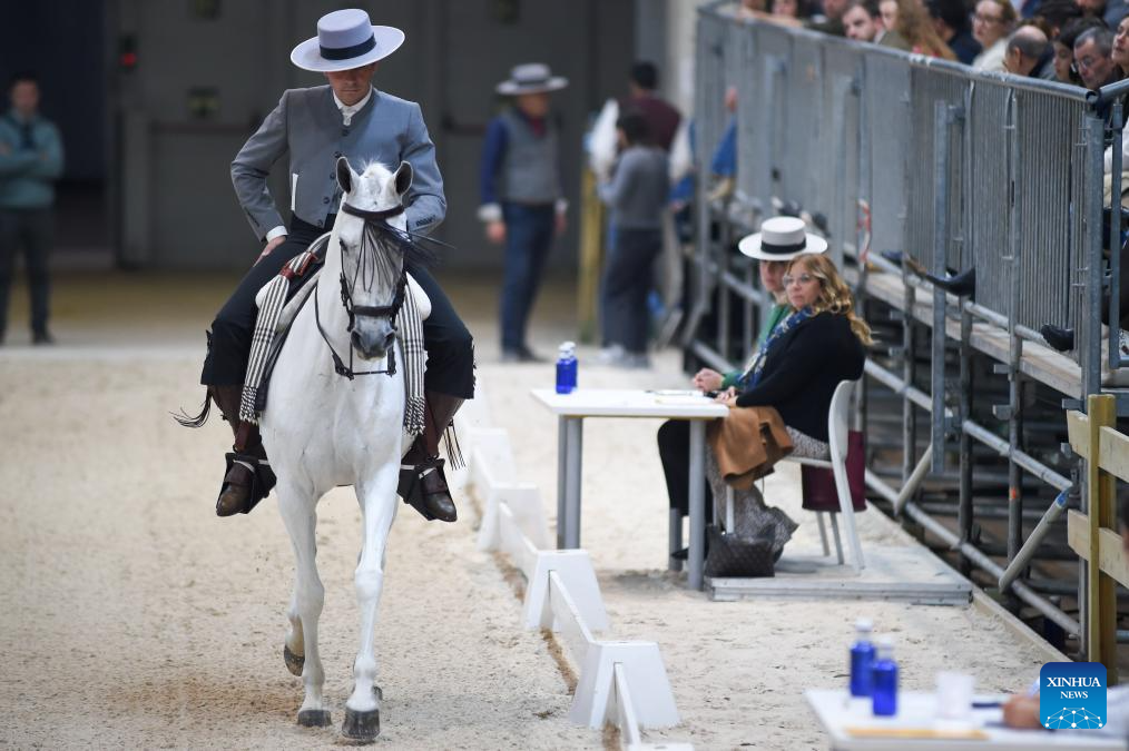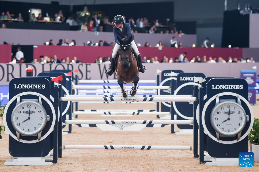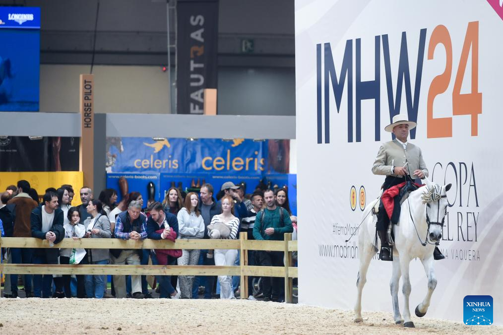 MADRID, 1 diciembre, 2024 (Xinhua) -- Imagen del 30 de noviembre de 2024 de un jinete participando en la Semana del Caballo de Madrid 2024 en el IFEMA, en Madrid, España. (Xinhua/Gustavo Valiente)