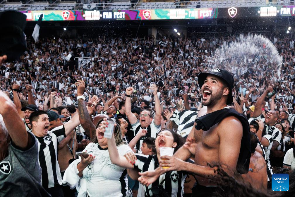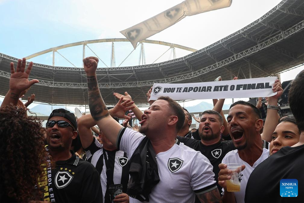RIO DE JANEIRO, 1 diciembre, 2024 (Xinhua) -- Imagen del 30 de noviembre de 2024 de aficionados de Botafogo de Brasil animando previo a la transmisión de la final de la Copa Conmebol Libertadores en el Estadio Nilton Santos, en Río de Janeiro, Brasil. Botafogo derrotó el sábado 3-1 a su club compatriota Atlético Mineiro y se consagró por primera vez en su historia como campeón de la Copa Libertadores de América. (Xinhua/Claudia Martini)