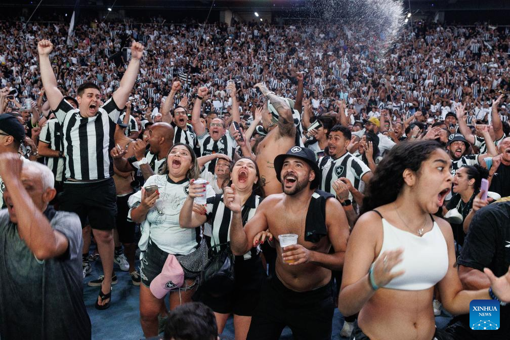 RIO DE JANEIRO, 1 diciembre, 2024 (Xinhua) -- Imagen del 30 de noviembre de 2024 de aficionados de Botafogo de Brasil festejando la obtención del título de campeones de la Copa Conmebol Libertadores durante la transmisión de la final en el Estadio Nilton Santos, en Río de Janeiro, Brasil. Botafogo derrotó el sábado 3-1 a su club compatriota Atlético Mineiro y se consagró por primera vez en su historia como campeón de la Copa Libertadores de América. (Xinhua/Claudia Martini)