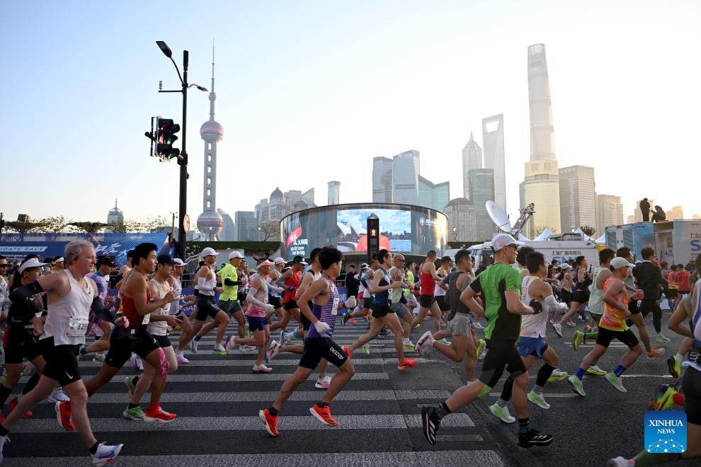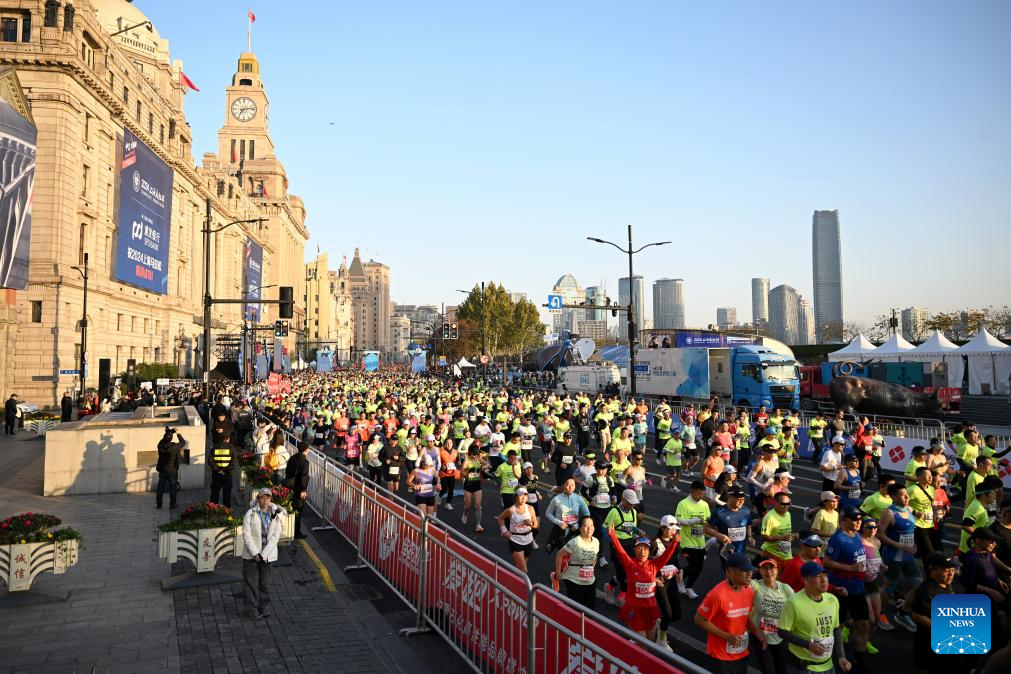 SHANGHAI, 1 diciembre, 2024 (Xinhua) -- Participantes corren durante el Maratón de Shanghai 2024, en Shanghai, en el este de China, el 1 de diciembre de 2024. (Xinhua/Chen Haoming)