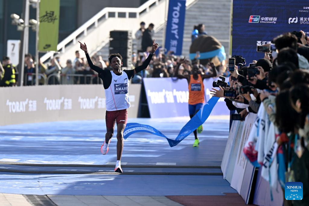 SHANGHAI, 1 diciembre, 2024 (Xinhua) -- Samsom Amare (frente), de Eritrea, cruza la línea de meta durante el Maratón de Shanghai 2024, en Shanghai, en el este de China, el 1 de diciembre de 2024. (Xinhua/Chen Haoming)