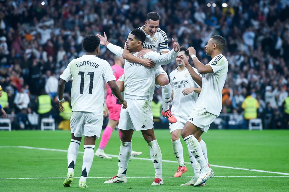 MADRID, 2 diciembre, 2024 (Xinhua) -- Imagen del 1 de diciembre de 2024 de Jude Bellingham (2-i), de Real Madrid, festejando la primera anotación durante el partido correspondiente a LaLiga española, entre Real Madrid y Getafe CF, celebrado en el Estadio Santiago Bernabéu, en Madrid España. (Xinhua/Gustavo Valiente)