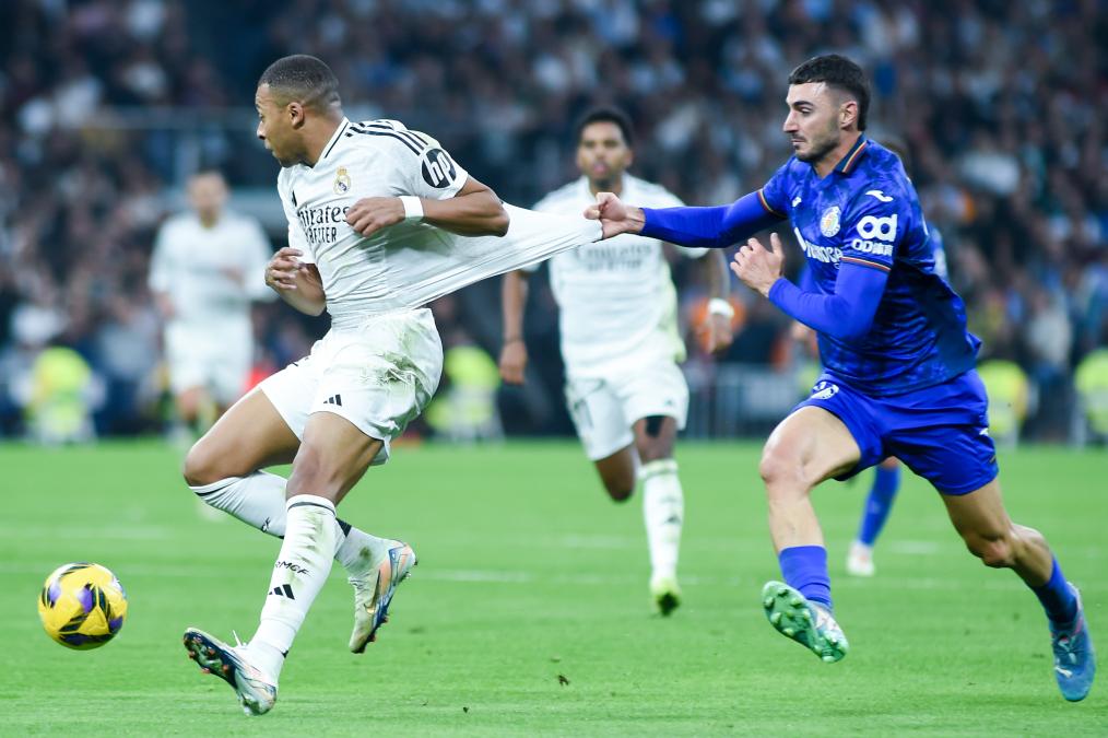 MADRID, 2 diciembre, 2024 (Xinhua) -- Imagen del 1 de diciembre de 2024 de Kylian Mbappe (i), de Real Madrid, disputando el balón con Juan Iglesias, de Getafe CF, durante el partido correspondiente a LaLiga española, entre Real Madrid y Getafe CF, celebrado en el Estadio Santiago Bernabéu, en Madrid España. (Xinhua/Gustavo Valiente)