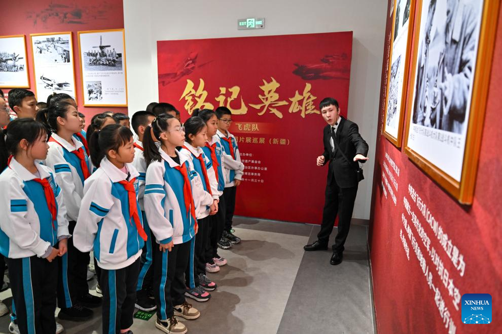 URUMQI, 2 diciembre, 2024 (Xinhua) -- Imagen del 30 de noviembre de 2024 de estudiantes de la escuela secundaria Bayi de Urumqi visitando una exposición fotográfica dedicada a los Tigres Voladores, en Urumqi, capital de la región autónoma uygur de Xinjiang, en el noroeste de China. Los Tigres Voladores, conocidos oficialmente como Grupo de Voluntarios Estadounidenses de la Fuerza Aérea China, fueron fundados en 1941 por el general estadounidense, Claire Lee Chennault. Llegaron a China para ayudar al pueblo chino a luchar contra las tropas japonesas invasoras. (Xinhua/Ding Lei)