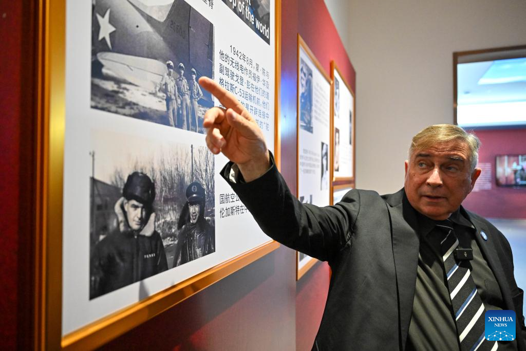 URUMQI, 2 diciembre, 2024 (Xinhua) -- Imagen del 30 de noviembre de 2024 de Jeffrey Greene, presidente de la Fundación del Patrimonio de la Aviación Sino-Americana, gesticulando mientras visita una exposición fotográfica dedicada a los Tigres Voladores, en Urumqi, capital de la región autónoma uygur de Xinjiang, en el noroeste de China. Los Tigres Voladores, conocidos oficialmente como Grupo de Voluntarios Estadounidenses de la Fuerza Aérea China, fueron fundados en 1941 por el general estadounidense, Claire Lee Chennault. Llegaron a China para ayudar al pueblo chino a luchar contra las tropas japonesas invasoras. (Xinhua/Ding Lei)