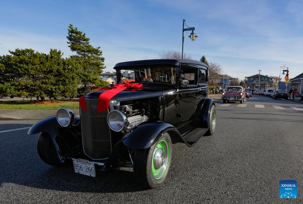 RICHMOND, 2 diciembre, 2024 (Xinhua) -- Imagen del 1 de diciembre de 2024 de un automóvil clásico recorriendo la calle durante el evento anual Crucero Navideño de Automóviles Clásicos, en Richmond, Columbia Británica, Canadá. (Xinhua/Liang Sen)