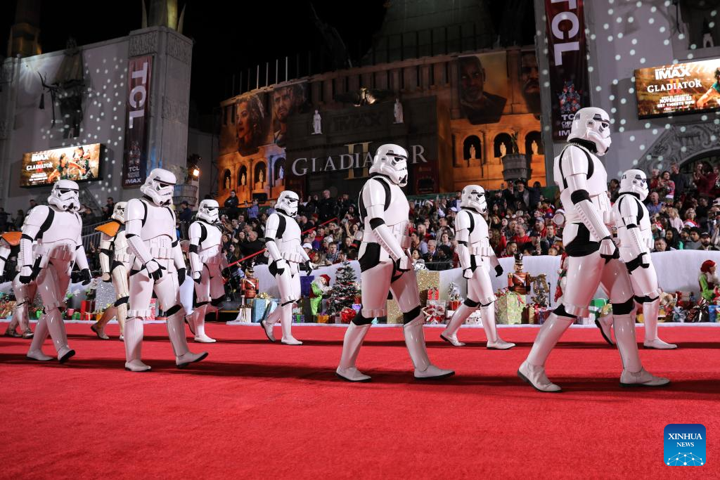 LOS ANGELES, 2 diciembre, 2024 (Xinhua) -- Imagen del 1 de diciembre de 2024 de participantes disfrazadas de personajes de Star Wars participando durante la edición 92 del Desfile Anual Navideño de Hollywood, en Los Angeles, California, Estados Unidos. (Xinhua/Zeng Hui)