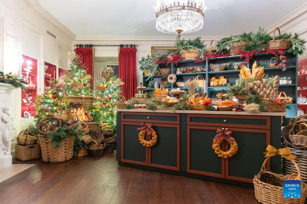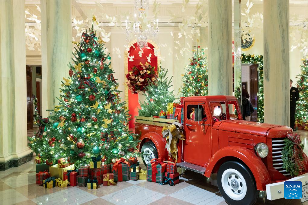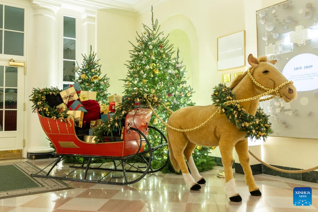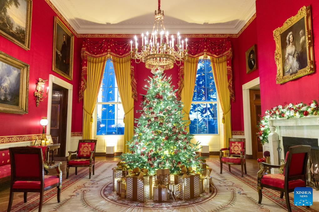 WASHINGTON, 2 diciembre, 2024 (Xinhua) -- Imagen del 2 de diciembre de 2024 de una vista previa para los medios de comunicación de las decoraciones navideñas en la Casa Blanca, en Washington, D.C., Estados Unidos. (Xinhua/Hu Yousong)