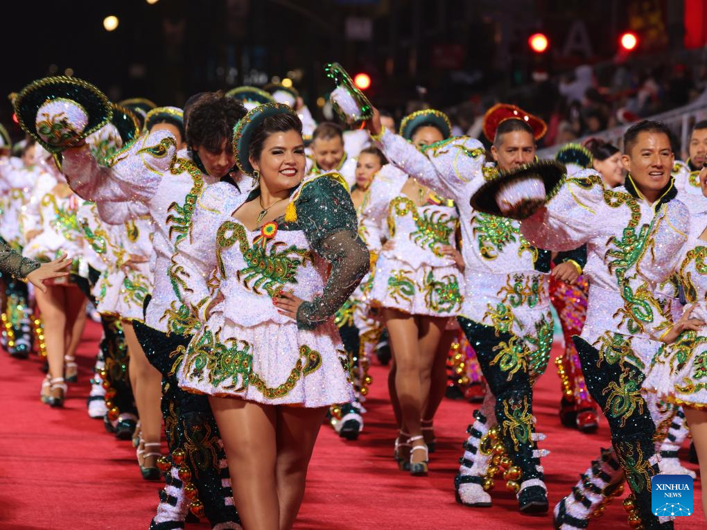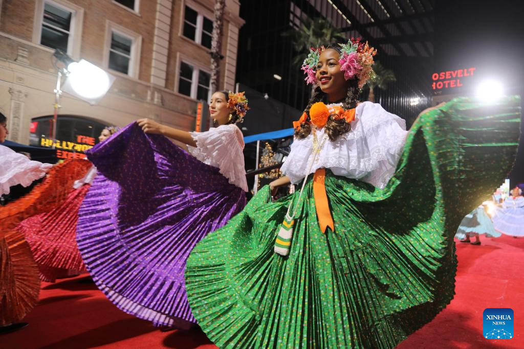 (241202) -- LOS ANGELES, 2 diciembre, 2024 (Xinhua) -- Imagen del 1 de diciembre de 2024 de participantes bailando durante la edición 92 del Desfile Anual Navideño de Hollywood, en Los Angeles, California, Estados Unidos. (Xinhua/Zeng Hui) (oa) (ah) (vf)