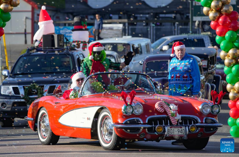 RICHMOND, 2 diciembre, 2024 (Xinhua) -- Imagen del 1 de diciembre de 2024 de personas disfrazadas con motivos navideños asistiendo al evento anual Crucero Navideño de Automóviles Clásicos, en Richmond, Columbia Británica, Canadá. (Xinhua/Liang Sen)