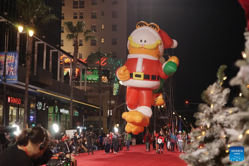 LOS ANGELES, 2 diciembre, 2024 (Xinhua) -- Imagen del 1 de diciembre de 2024 de un globo de Garfield Santa visto durante la edición 92 del Desfile Anual Navideño de Hollywood, en Los Angeles, California, Estados Unidos. (Xinhua/Zeng Hui)